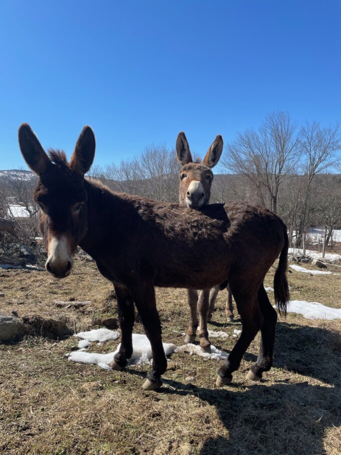 I was in holistic medicine and after covid, I needed a change. We found a rundown farmhouse in Buckfield, renovated it and moved in with our three cows. Since then, we’ve bred those cows and acquired more so our herd is up to about 20. We got the donkeys in 2022 from a farm in Aroostook—way up there. They were on a sheep farm. The farm got a large pack of donkeys as livestock guardian animals and the story is they bonded with each other and not the sheep and a pack of coyotes came in and wiped out a bunch of their sheep. The owners were pissed, so they sold the donkeys for so cheap. They all sold within minutes, we did not get any then, but were put on a wait list and at the last minute someone backed out, so we stepped in and grabbed those guys right up.